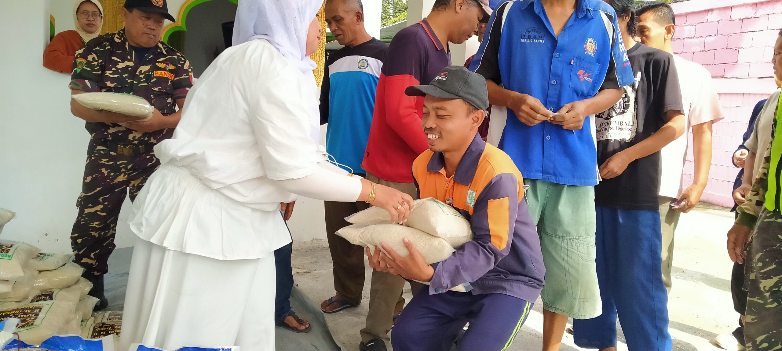 Foto : Abah Iksan saat melakukan penyerahan beras kepada warga yang datang ke lokasi